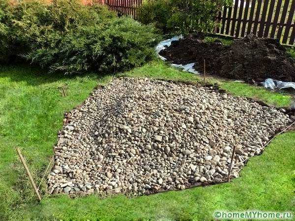 - На щебень сверху засыпается песок и утрамбовывается. Слой песка должен быть толщиной 5 сантиметров. Поверх песка насыпается смесь торфа с перегноем, щепой, мульчей и удобрениями.