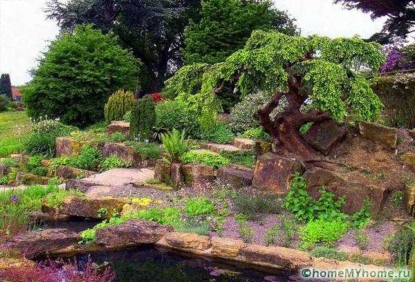 - Так как альпинарий является украшением сада, то он должен быть виден со всех сторон. Это значит, что первой особенностью является правильный выбор места.