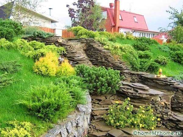 Одним из лучших видов будет альпийская горка с водопадом. Это означает, что с одной стороны горки надо будет сделать земляную насыпь. С другой стороны создаётся нагромождение камней в виде уступа скалы.