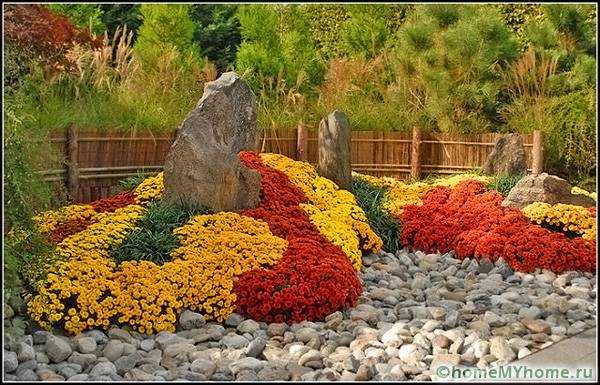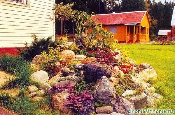 В альпинарии цветник всегда приковывает к себе взгляд. А то, что растения растут как будто на скалах, делает его ещё более красивым.