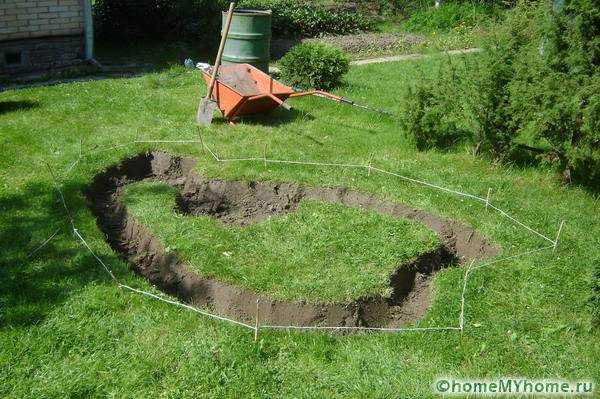 - При помощи рулетки и шнура с колышками размечается участок будущего альпинария. Обозначенное место очищается от мусора, снимается дёрн и слой земли глубиной до 40 сантиметров.