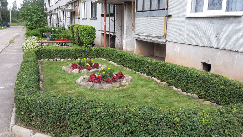 Цветник — это маленькая архитектурное чудо, окружённое изумрудной зеленью травы.