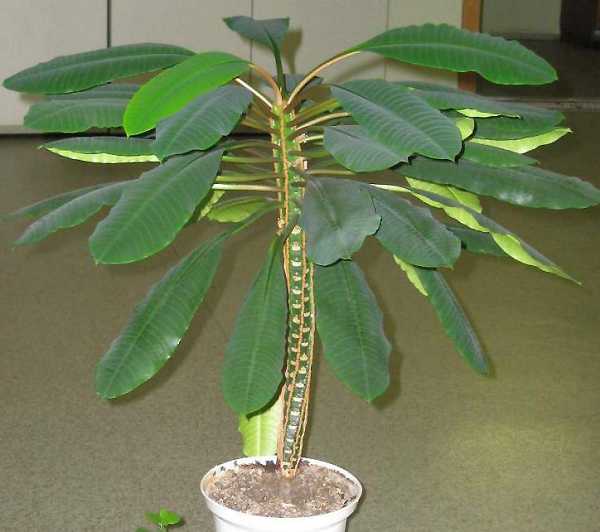 Эффектное растение относится к виду молочайных, выделяющих белый сок при повреждении. В комнатных условиях вырастает не выше метра, хотя в природе достигает трех метров. Красивый цвет листьев меняется с возрастом. Любит хорошее освещение и теплые помещения.