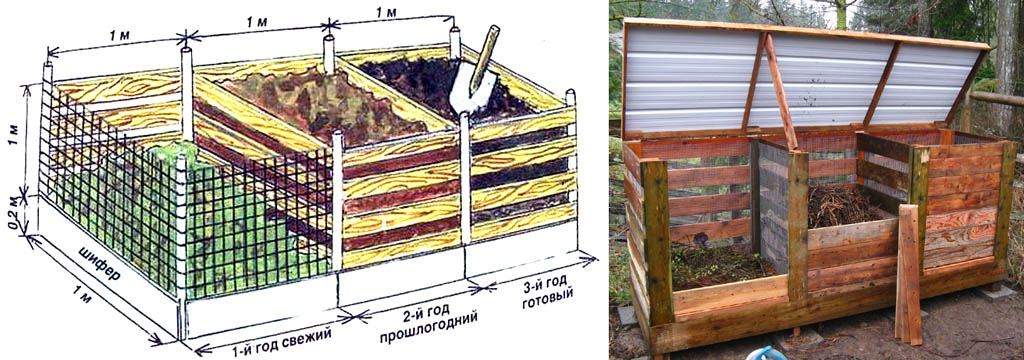 Для самостоятельной сборки обычно используется дерево. Из брусков сооружают каркас, на который на небольшом расстоянии друг от друга набивают дощечки. Это необходимо для проветривания перегнивающей массы.