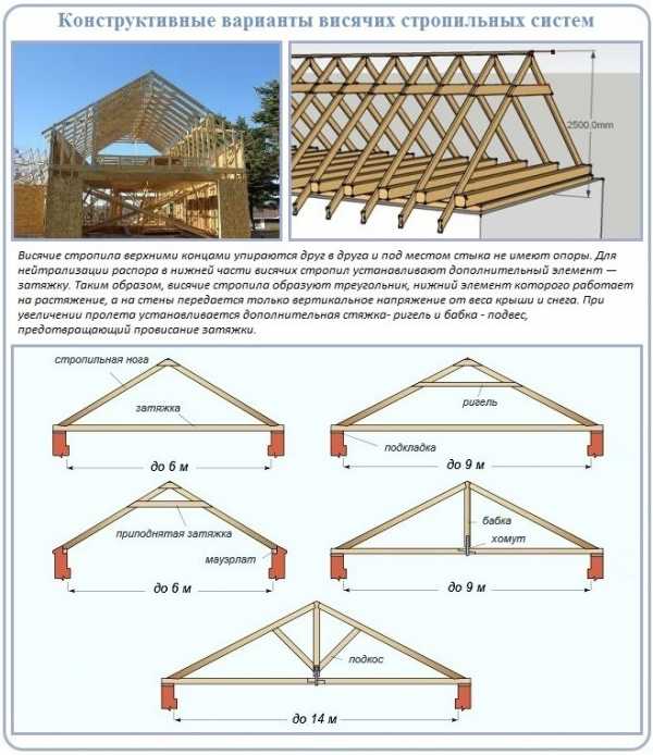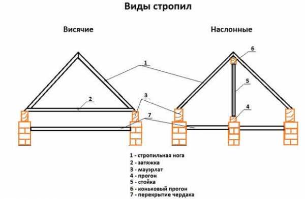 Устройство висячих и наслонных стропиль двускатной крыши.