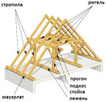 Важно! Самая простая стропильная система состоит только из мауэрлата, стропил и конькового прогона. С увеличением сложности кровли повышается количество дополнительных элементов, упрочивающих конструкцию, а также компенсирующих нагрузки на прогиб и распирание.