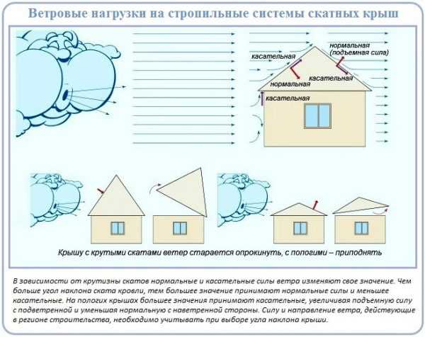 Климатические данные в немалой степени воздействуют на выбор крыши и устройство стропильной системы. В регионах с изобильным выпадением снега нецелесообразно возводить конструкции с незначительной крутизной, способствующей образованию снежных залежей. В районах с порывистыми ветрами наоборот предпочтительны обтекаемые и низко-скатные формы, которые сложно будет сорвать и унести мощному погодному явлению.