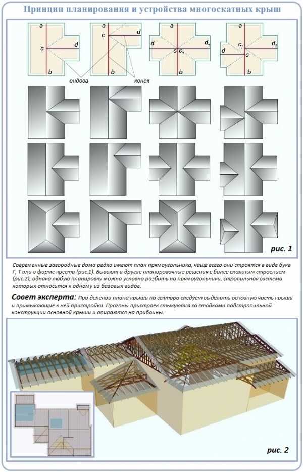 Стропильную конструкцию любой сложности можно представить как совокупность простых форм. Чтобы легче было разобраться в строительных хитросплетениях, объект лучше условно разбить на отдельные блоки. Они-то и подскажут, как возводить каждую из частей и соединять друг с другом перечисленные выше базовые типы стропильных каркасов.