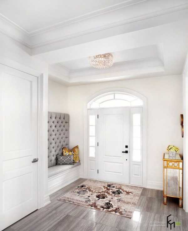 В этой прихожей нет стандартных шкафов для одежды и полочек для обуви, нет даже подставки для зонтов. Зато есть удобная кушетка с подушками, зеркальный комод, роскошная люстра и все это в белоснежной отделке просторного помещения.