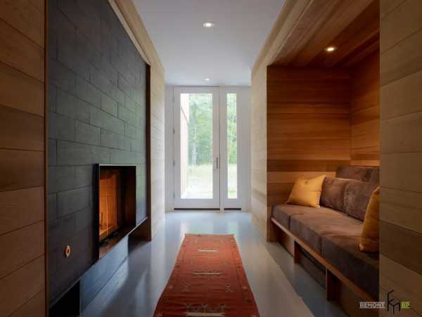 А некоторые прихожие настолько просторны и роскошны, что могут позволить себе камин со встроенной напротив мягкой зоной. Древесина и камень в отделке необычного помещения прибавили природной теплоты пространству.