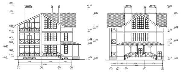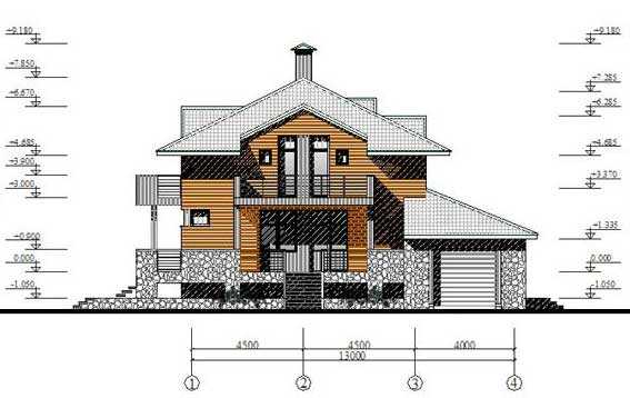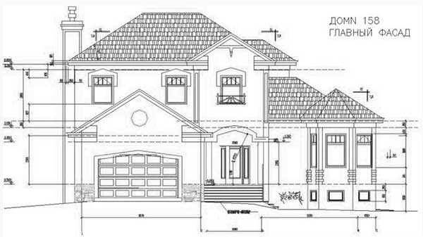 Красивый дом с башенками и сложной стропильной системой. Размеры в плане 12 х 13 м., площадь 229 кв.м. В проекте (dwg) на украинском языке фасады, планы, разрезы, фундаменты, перекрытия, кровля.