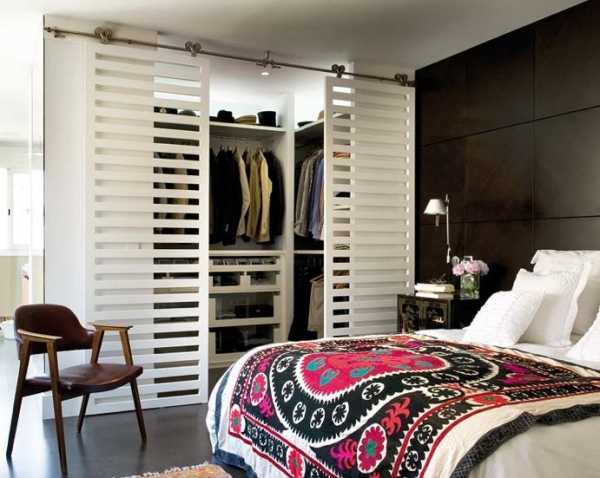 Широкую и короткую комнату можно удлинить визуально, если расположить гардеробную вдоль одной из стен, по всей ее длине.