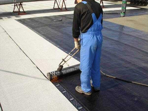 На очищенную, обработанную праймером на битумной основе поверхность, при помощи горелки наплавляют полосы кровли. Каждая полоса должна перекрывать предыдущую минимум на 10 см. Качественно наплавленный материал может служить до 30 лет.