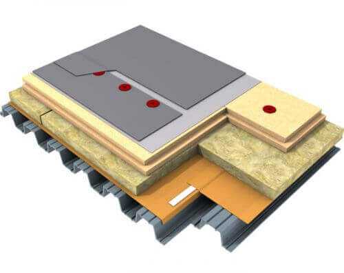 После укладки теплозащитного слоя, выполняются работы по гидроизоляции кровли, а использование дополнительной внутренней термоизоляции помещений в виде подвесных или натяжных потолков позволяет полностью компенсировать этот недостаток горизонтальной кровли.