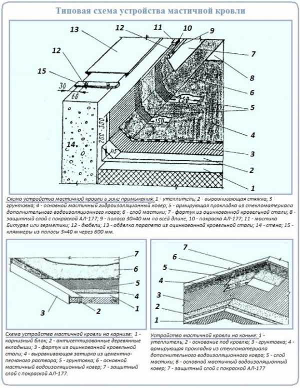 Работу по устройству мастичного ковра начинают с низких участков кровли, продвигаются к верхним точкам. На бортики по вертикальным стенкам устанавливается оцинкованная металлическая планка для защиты верхнего края. Карнизы защищают оцинкованным фартуком.