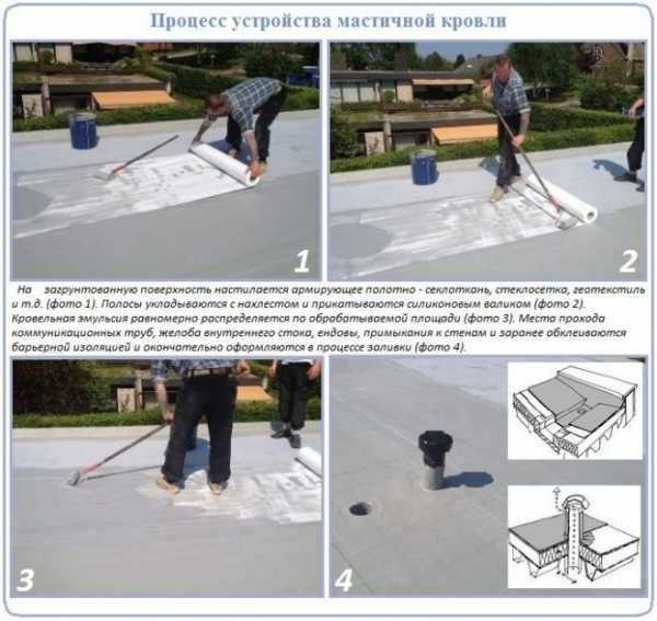 - Действия повторяются до формирования кровли с запланированной толщиной. В завершении наносят слой холодной битумно-латексной эмульсии или горячей битумно-резиновой мастики или окрашивают.