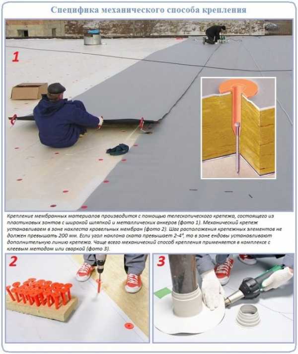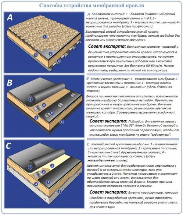 - ПВХ-мембраны, созданные на основе полиэфирной сетки с покрытием из пластифицированного полимера. Зачастую крепятся к основанию клеевым способом на холодную мастику или клеевой состав. В единое полотно полосы соединяются сваркой горячим воздухом. Желающие провести монтаж мягкой мембранной кровли своими руками могут воспользоваться балластной методикой, согласно которой полотна укладываются свободно и просто прижимаются балластом из окатанной гальки, гравия, бетонных плит или тротуарной плитки. Для облегчения процесса крепления ПВХ-полотен есть еще телескопический крепеж с широкой площадью пластиковой опоры и саморезом внутри крепежной системы;