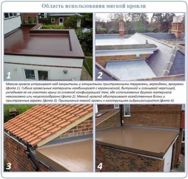 Перечисленные виды мягкой кровли крыши позволяют покрывать с разной степенью крутизны. С помощью мастичных и рулонных материалов обустраивают преимущественно плоские и низко-скатные конструкции. Это могут быть крыши малоэтажных зданий в стиле техно или хай-тек, солидные навесы над пристроенными террасами, обширным крыльцом с мощными колоннами, эркером, верандой.