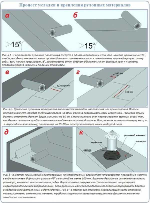 Укладку рулонных покрытий на плоские кровли ведут от середины площадки, продвигаясь в обоих направлениях к периферии. На скатные кровли наплавляют и наклеивают, продвигаясь от нижележащих точек по скатам вверх. Если в рельефе кровли есть конструктивные понижения: ендовы, объекты внутреннего стока и т.д., укладка проводится со стартом от них. Перед работой барьерной гидроизоляцией обклеивают участки кровли, испытывающие наибольшую нагрузку, к ним относятся разжелобки, окружение коммуникационных проходов, примыкания, края свесов.