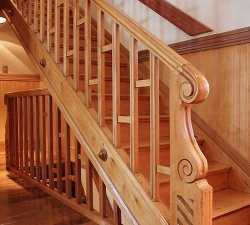 Для того, чтобы обезопасить спуск и подъем по лестнице, следует установить перила. Оптимальная удобная высота их установки составляет около 1 м. Если лестница с одно стороны прилегает к стене, то поручни устанавливаются только одной из сторон. Возможен вариант установки балясин фигурной или прямой формы. Бревенчатые лестницы чаще всего оборудуют простыми и лаконичными перилами. Для фиксации балясин используют шпильки или саморезы. Второй вариант более надежный.