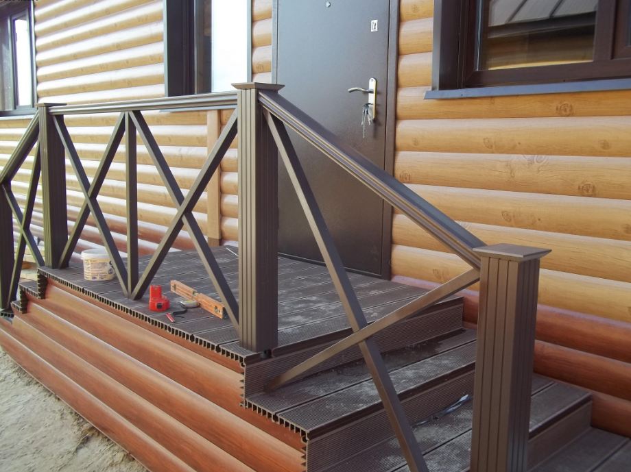 Когда вы вкручиваете саморезы, их, желательно, утапливать в дерево, чтобы при движении по лестнице никто не споткнулся и не зацепился за их шляпку. Ограждения для деревянного крыльца лучше тоже делать из дерева. Это очень важно, чтобы экстерьер был гармоничным.