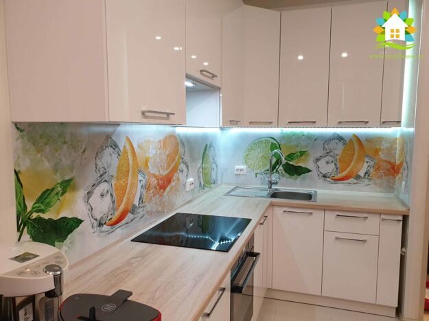ABS – материал из трех компонентов, акрилонитрила, бутадиена и стирола. В качестве кухонного фартука используют листы АБС-пластика, которые максимально схожи с натуральным стеклом. Изображение на фартуки переносят методом фотопечати, бывает с матовым или глянцевым финишем.