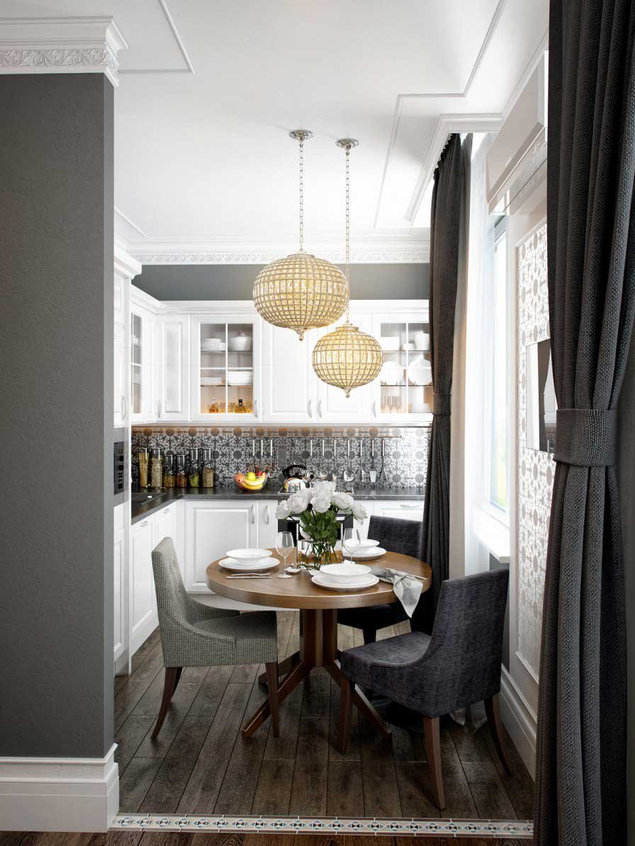 Поэтому не всегда есть возможность вместить на такую площадь обеденный стол, тем более большой. Очень хорошо, когда взамен маленькой кухни есть большая гостиная, в которой можно расположить обеденную зону для комфортной трапезы.