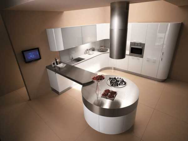 - Островная. Данный вариант больше подойдет для просторной кухни. Островная стойка может вмещать и рабочее место для приготовления пищи, и даже варочную поверхность, полностью меняя свое предназначение.