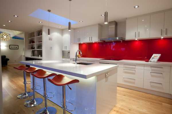 Красный кухонный фартук на фоне белой мебели смотрится очень эффектно