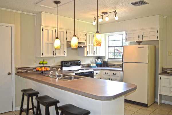 Барную стойку стоит установить на линии границы между местом для готовки и столовой зоной. Над ней стоит установить ряд светотехники с плафонами удлиненной формы. Рабочее место кулинара должно быть хорошо освещено с помощью мощных, ярких ламп.