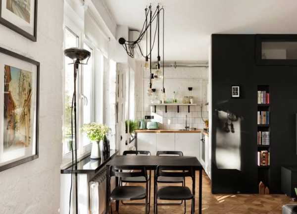 Обычно, обеденные зоны в таких квартирах располагают в нише, куда совсем не попадает солнечный свет. В таком случае уделите максимум внимания освещению, так как от него зависит, будет ли вам уютно там обедать.