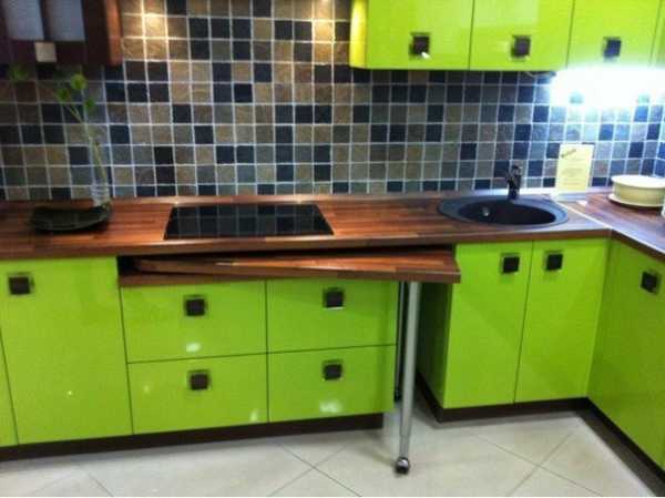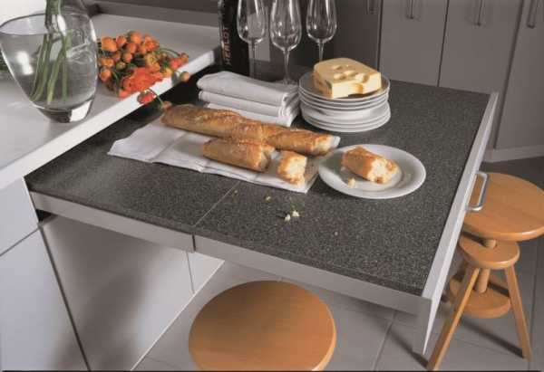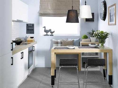 Оптимальным выбором для маленьких кухонь считается покупка складных или встроенных конструкций, а также трансформеров. Они в собранном виде не занимают много места, а их раскладывание осуществляется только в случае возникновения необходимости в этом.