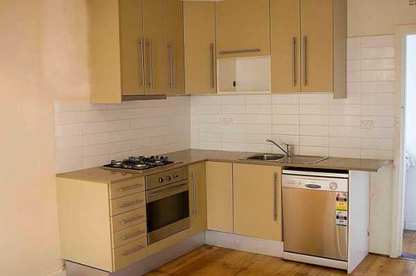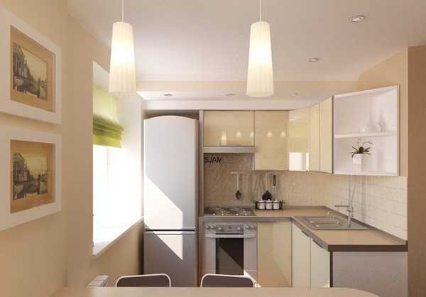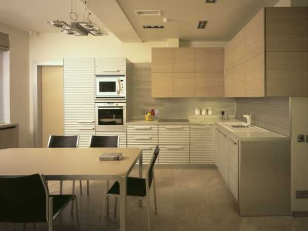 Угловая бежевая кухня в современном стиле. Стоимость – 3200 долларов. Размер помещения – 6 метров.
