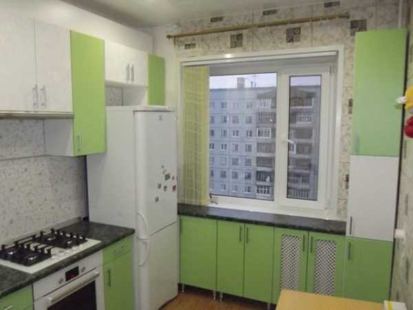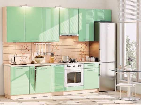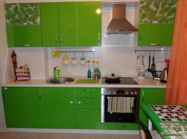 Угловая современная зеленая кухня с пластиковыми фасадами зеленого цвета. Площадь всей кухни – 8 кв.м. Стоимость – 2000 долларов.