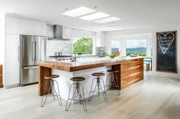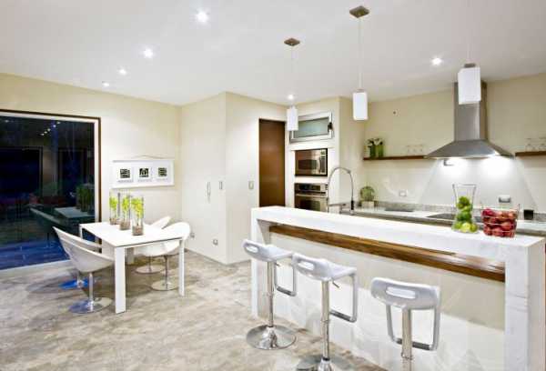 Для молодежных стилей дизайна, популярностью пользуются барные стойки для кухни, на которых вполне можно пообедать семье из 2х человек, либо выпить чашечку кофе с утра. Выглядит такой интерьер стильно и креативно, зонирует кухню и столовую в кухне – студии.