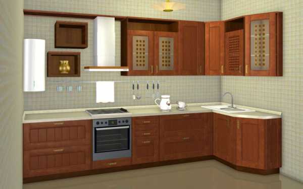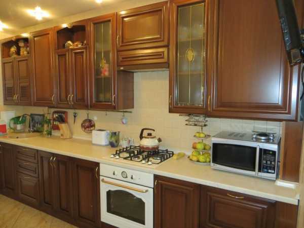 Угловой гарнитур в классическом стиле с фасадами из пленочного МДФ. Размер помещения – 9 кв.м., габариты гарнитура 2,8х1 м. Стоимость – 4500 долларов.