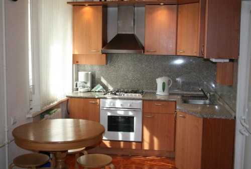 - прекрасным выбором для такой кухни считается установка углового кухонного гарнитура, обеспечивающего оставление довольно большого свободного пространства в одной стороне помещения;