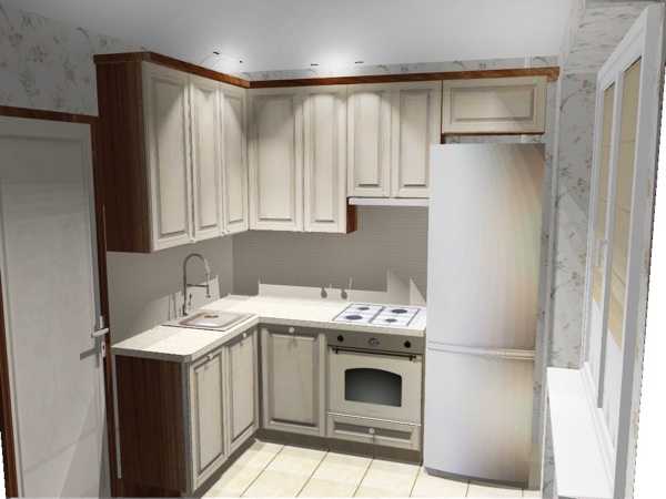 Угловая классическая бежевая кухня с фасадами МДФ. Стоимость – 1800 долларов. Общая площадь помещения 7,5 кв.м.