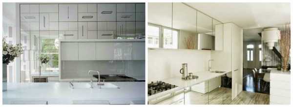 Весьма интересно выглядят прямые кухонные гарнитуры, фасад которых декорирован глянцевыми материалами или зеркальными поверхностями.
