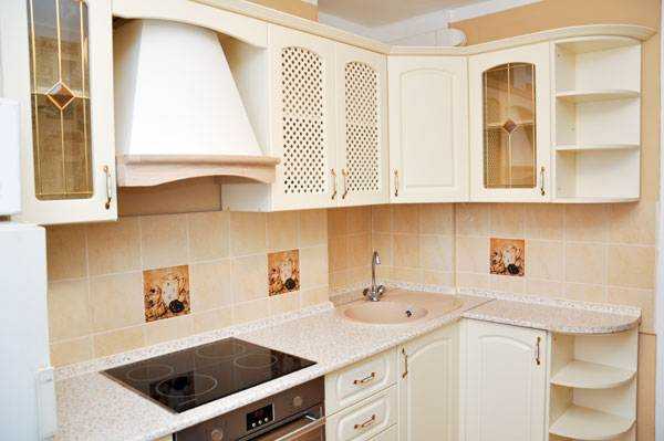 - угловая — такая расстановка всей мебели на маленькой кухне предполагает, что выбирается определенный угол помещения. В нем монтируется основная часть кухонного гарнитура. По бокам от него располагаются другие элементы, предназначенные для использования на кухне. Фото дизайн такой расстановки можно посмотреть ниже. Для комнаты малой квадратуры такое решение считается оптимальным;