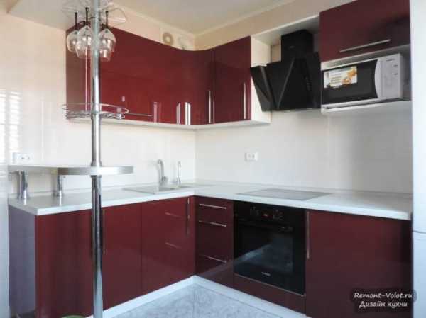Угловая современная кухня с барной стойкой с бордовыми фасадами из пластика. Площадь всей кухни – 9 кв.м. Стоимость – 2200 долларов.