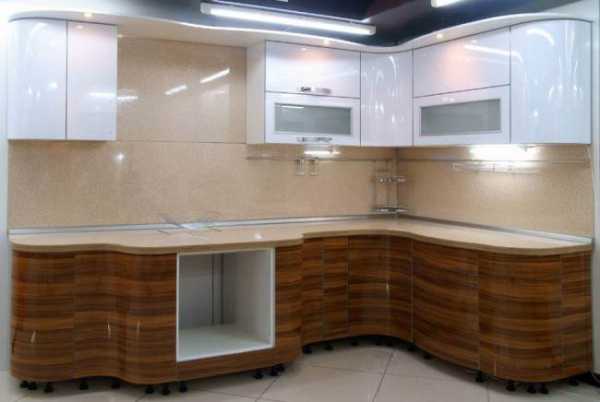 Глянцевая угловая кухня с фасадами из пластика белого цвета и с имитацией дерева. Размер гарнитура 3000х1800 мм. Стоимость — 2300 долларов.