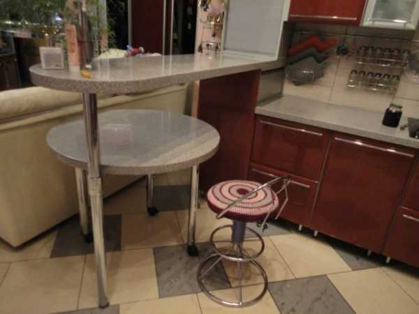 Обеденную зону оформляем в виде барной стойки или выдвижного столика, при условии, если не придется много готовить.