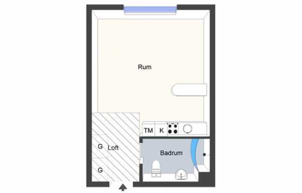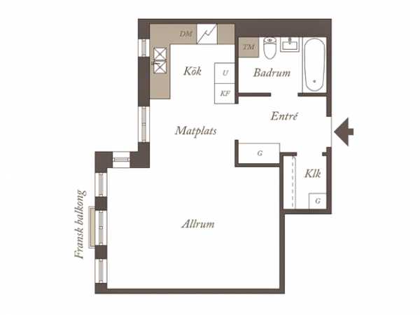 Всем известно, планировка в панельных домах Москвы стандартная, так что выбрать её нет возможности. Но и стокгольмский спальный район не предоставит большого ассортимента. Так и в этой квартире. Здесь можно развернуться только в квадратной комнате. Небольшая ванная расположена в углу, кухня же совмещена с гостиной, так как отдельно архитекторами она не была предусмотрена.
