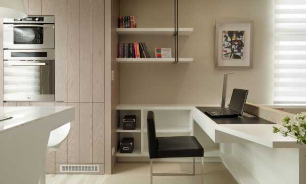 Одно помещение вмещает в себя зону кухни, столовой, место для принятия гостей и рабочий кабинет.