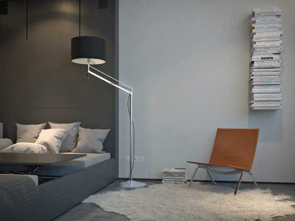 Лёгкое кресло, шкура на полу и стопка книг — вот единственные украшения спальной зоны