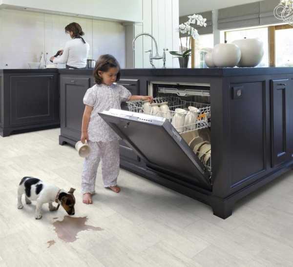 - виниловый ламинат водостойкий , поэтому может использоваться в ванной, кухне или аналогичных помещениях;