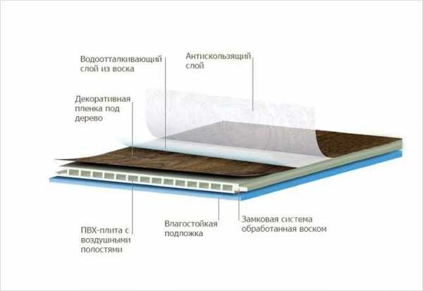 Во многом отличительные свойства и характеристики пластикового ламината обеспечены многослойной структурой материала. Основу конструкции представляет ПВХ-панель, а за счет воздушной камеры удается наделить ее отличными тепло- и звукоизоляционными свойствами. Такой пол будет теплым даже самой холодной зимой без дополнительного подогрева.