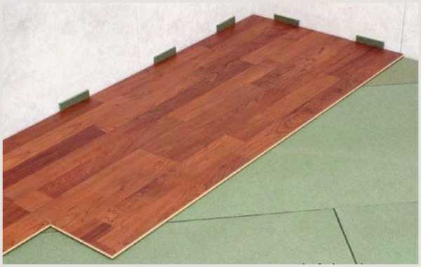 Первая панель отрезается на 1/3, чтобы получилось смещение, по периметру помещения устанавливают клинья, которые после укладки ламината убирают.