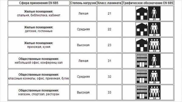 Кроме того, ламинат имеет деление на классы прочности. Всего их 7, но три первых в настоящее время сняты с производства из-за низких рабочих качеств и, в связи с этим, отсутствия спроса.